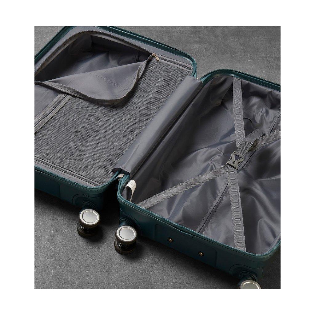 Interiér kufru je vybaven textilní přepážkou, fixačními popruhy a kapsou na zip pro organizaci vašich věcí. Díky tomu zůstane obsah bezpečně uložen i během delších cest.