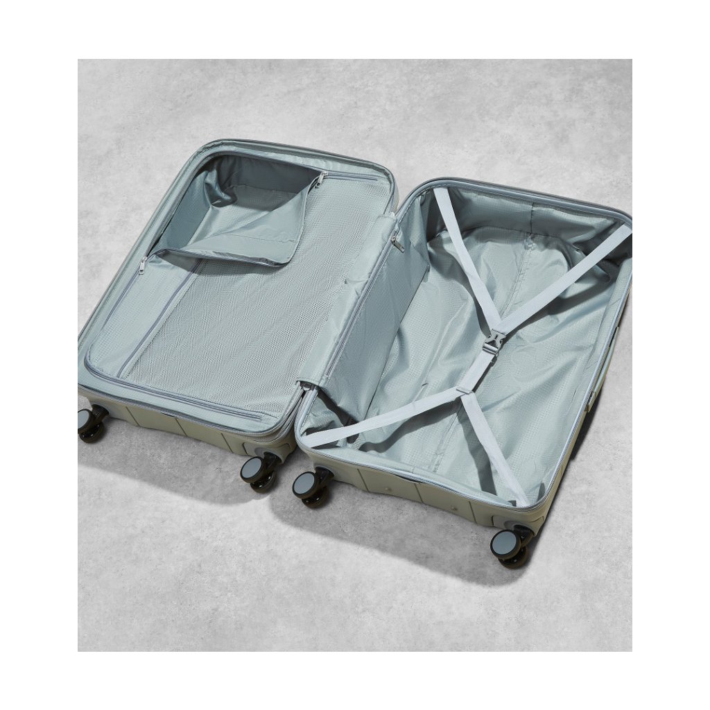 Kufr je vybaven praktickými funkcemi jako jsou plastová horní i boční madla, prostor na víku oddělený textilní přepážkou, vnitřní kapsa a jistící popruhy. Celý pojízdný systém je umístěn uvnitř kufru pod textilní podšívkou, což chrání mechanismus před poškozením během přepravy.