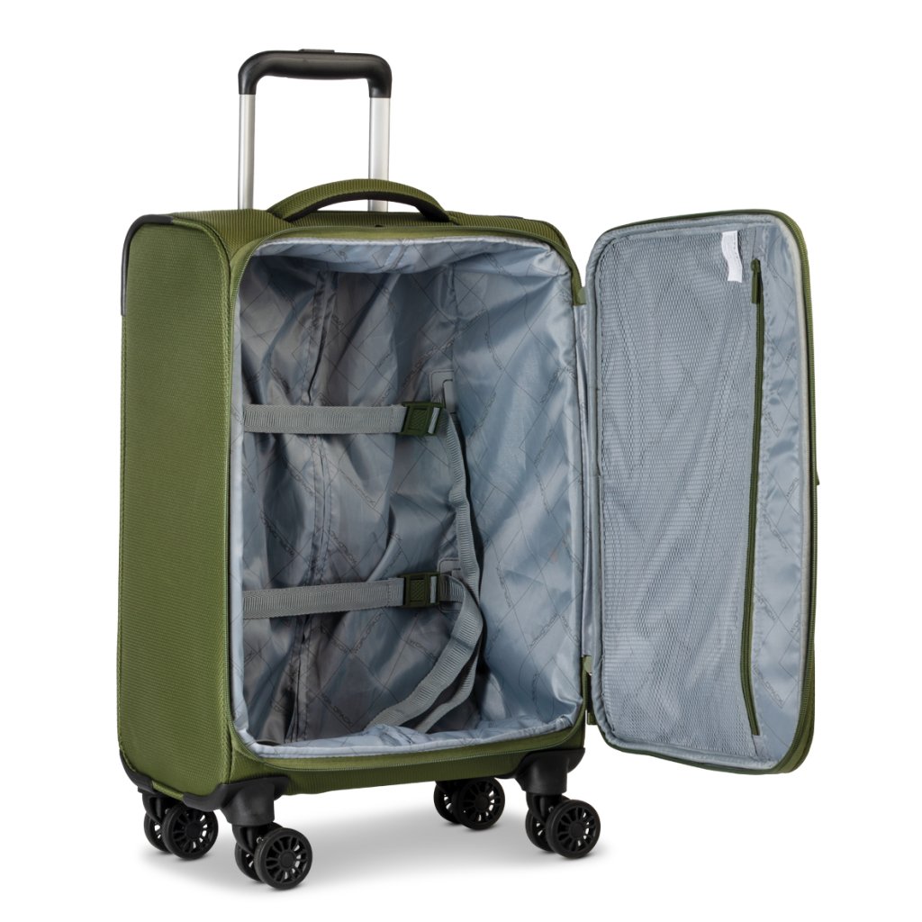 Kufr je vyroben z odolného 400D polyesteru, váží pouze 2,40 kg a je vybaven čtyřmi dvojitými kolečky otočnými o 360° pro snadný a plynulý pohyb v letištních halách i městských ulicích.