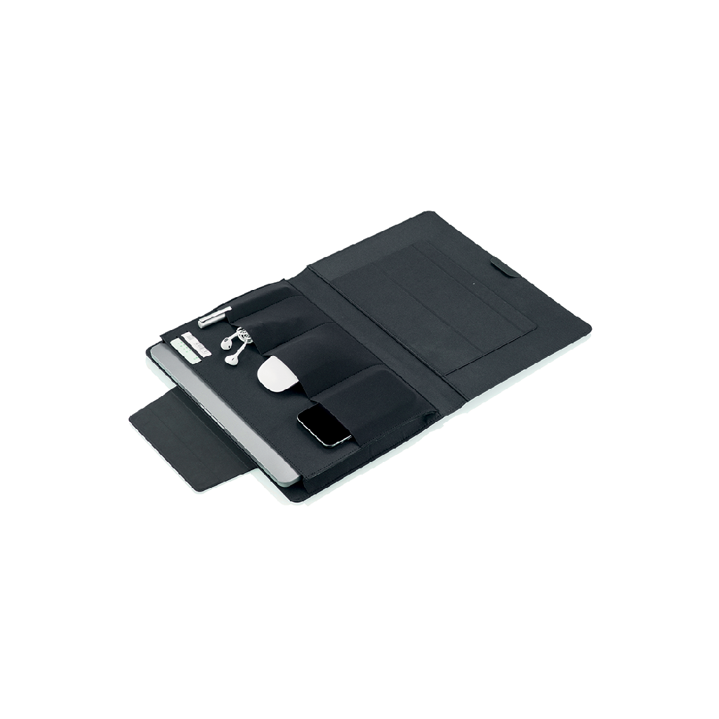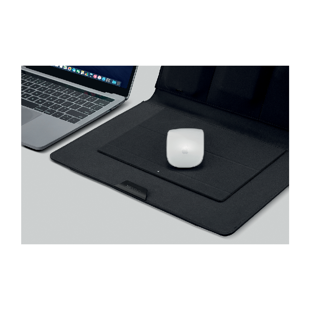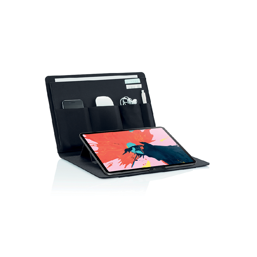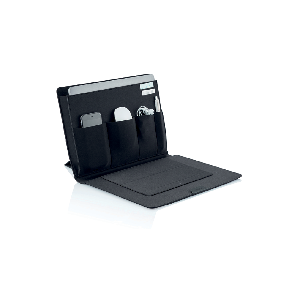 Chytrá mobilní kancelář pro pohodlnou práci na cestách vám nabídne úložný prostor pro notebook 13" a tablet 12.9", magnetický stojan na notebook, držák na tablet a podložku pod myš. Vyrobena z recyklovatelného materiálu rPET. Pracujte pohodlně odkudkoliv!