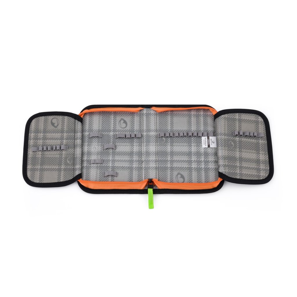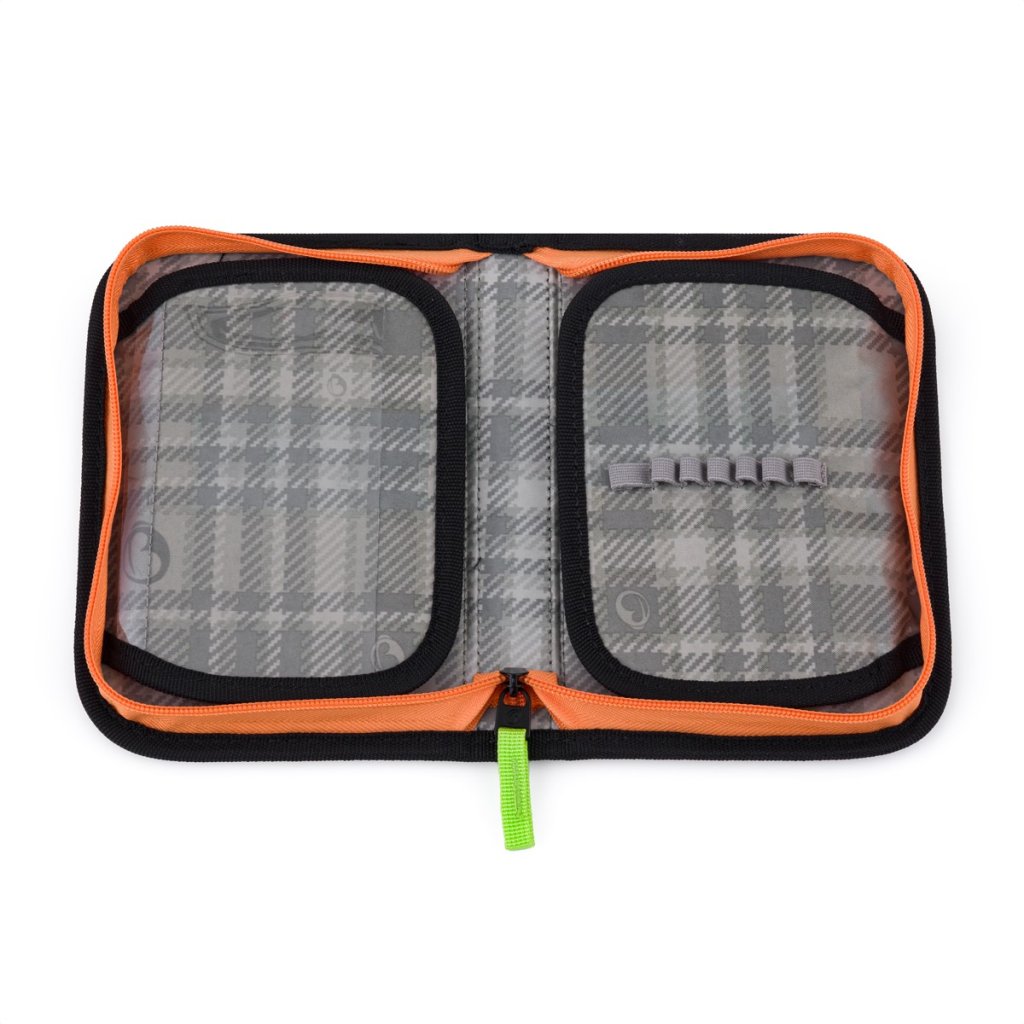 Penál je dvouchlopňový, což umožňuje snadný přístup ke všem pomůckám. Na horní straně chlopní se nacházejí průhledné kapsy, které jsou ideální pro uložení rozvrhu hodin nebo poznámek. Po otevření chlopní se objeví řada pružných gumových úchytů, které bezpečně drží tužky, pastelky, fixy, kružítko, gumu i ořezávátko.