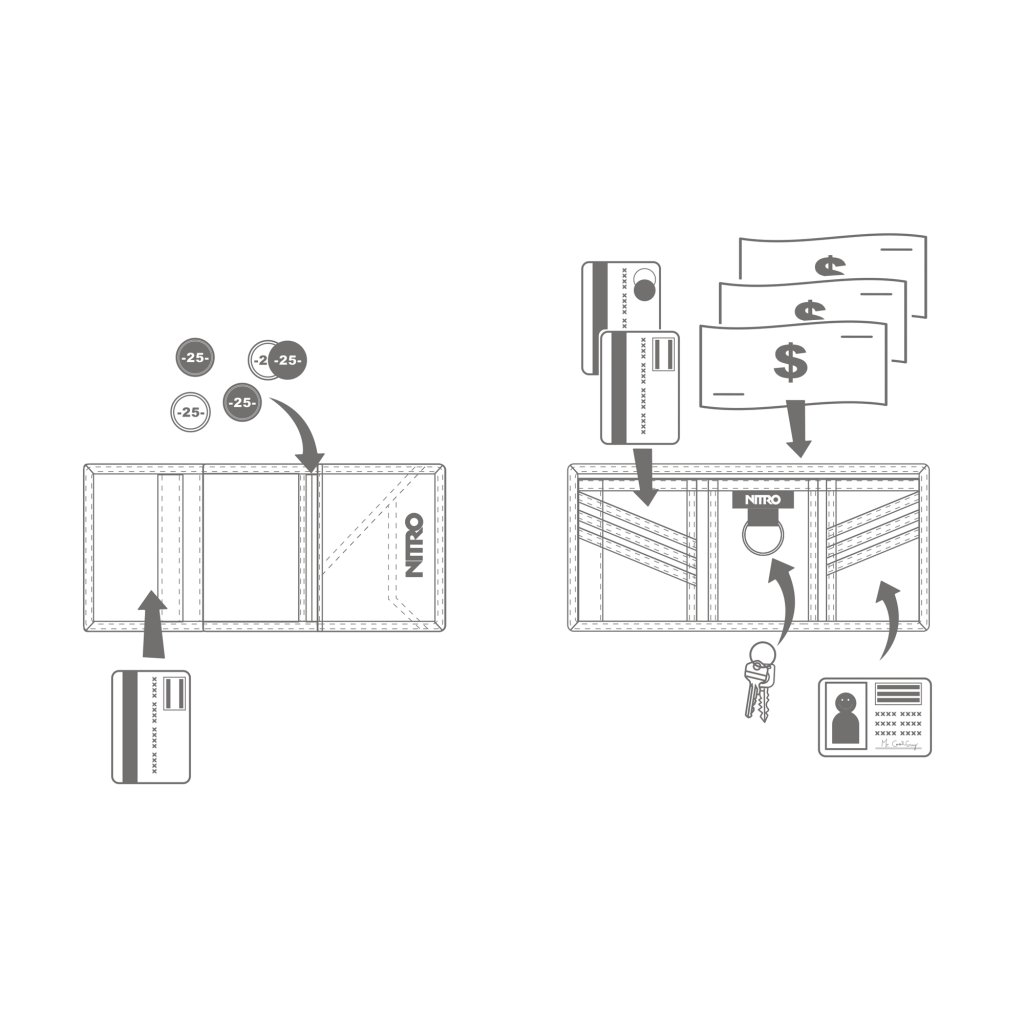 Textilní peněženka NITRO WALLET graphite s jednoduchým zavíráním na suchý zip. Obsahuje přihrádky na karty a doklady, kapsičku na drobné na zip, očko na klíče nebo řetízek....