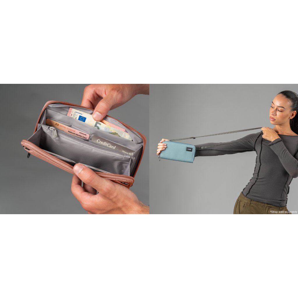 Díky unikátní konstrukci můžete peněženku nosit jako crossbody tašku, přes rameno nebo v ruce. Upevňovací body umožňují připnutí k tašce Pacsafe nebo bezpečnostnímu popruhu pro extra ochranu.