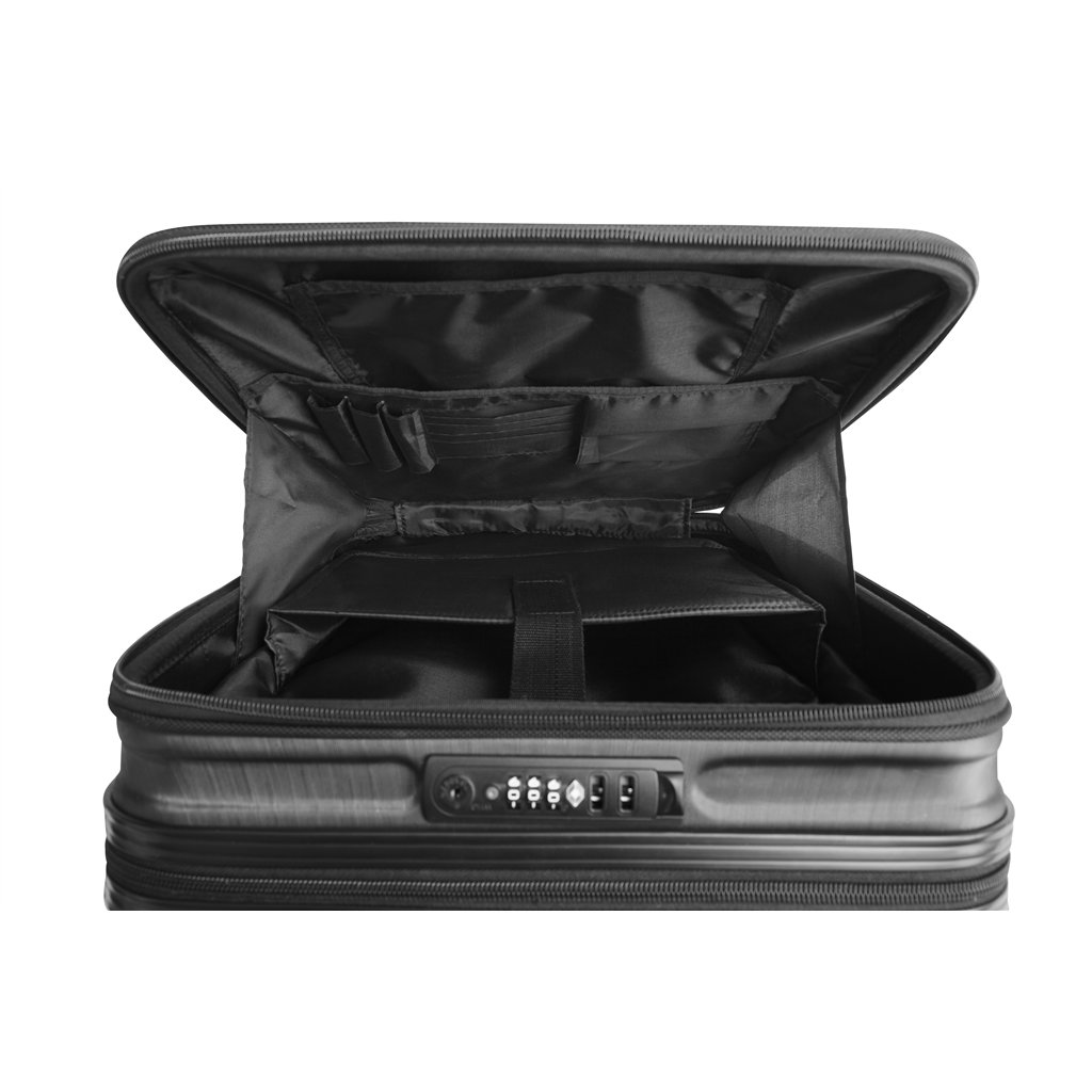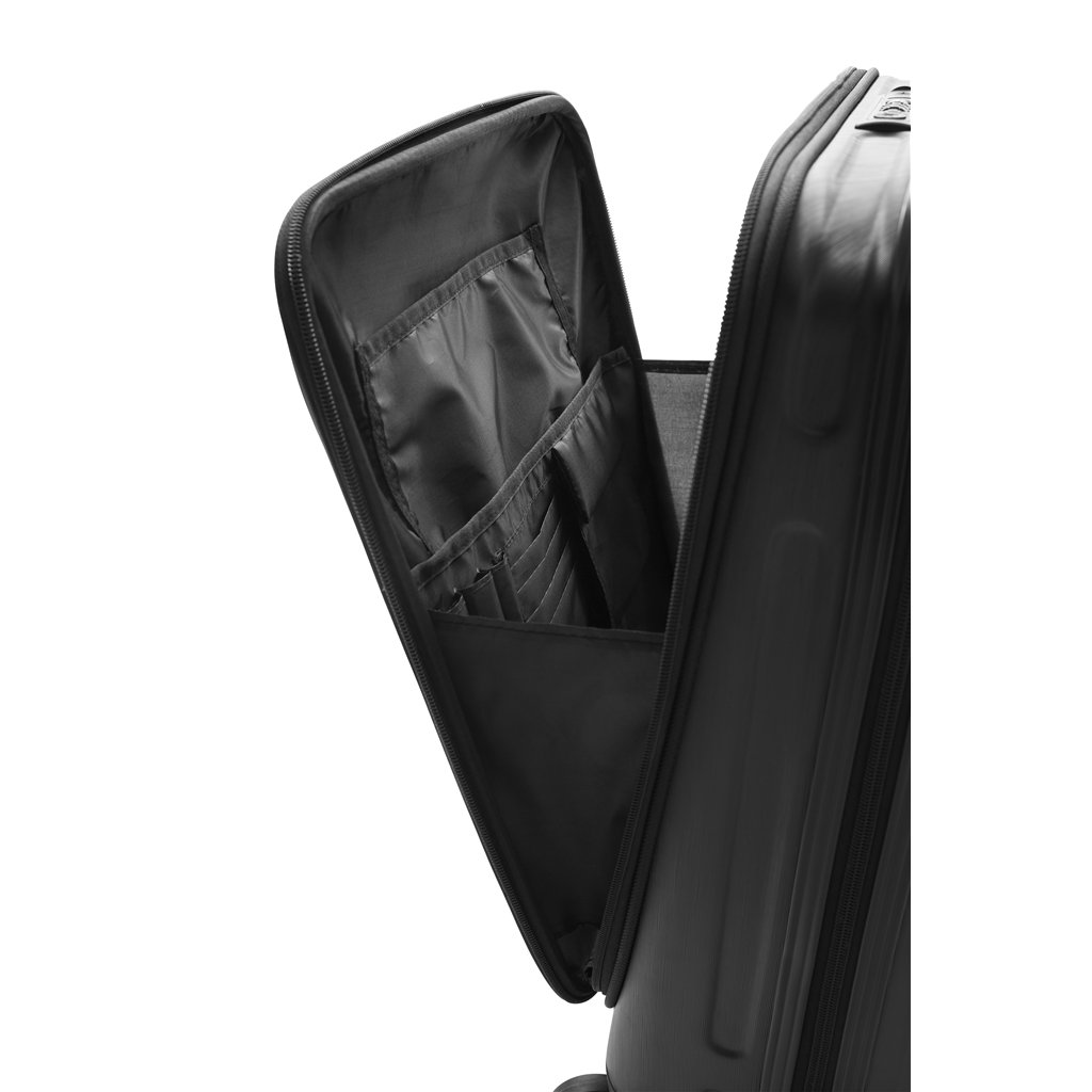 Kufr disponuje přední výklopnou kapsou s vnitřní přihrádkou na notebook o velikosti až 15", což umožňuje snadný přístup k elektronice bez nutnosti otevírat celý kufr. Vnitřní prostor je velký a vybaven fixačními pásky pro bezpečné uložení oblečení a dalších věcí. Síťová kapsa uzavíratelná na zip nabízí další úložný prostor pro drobnosti.