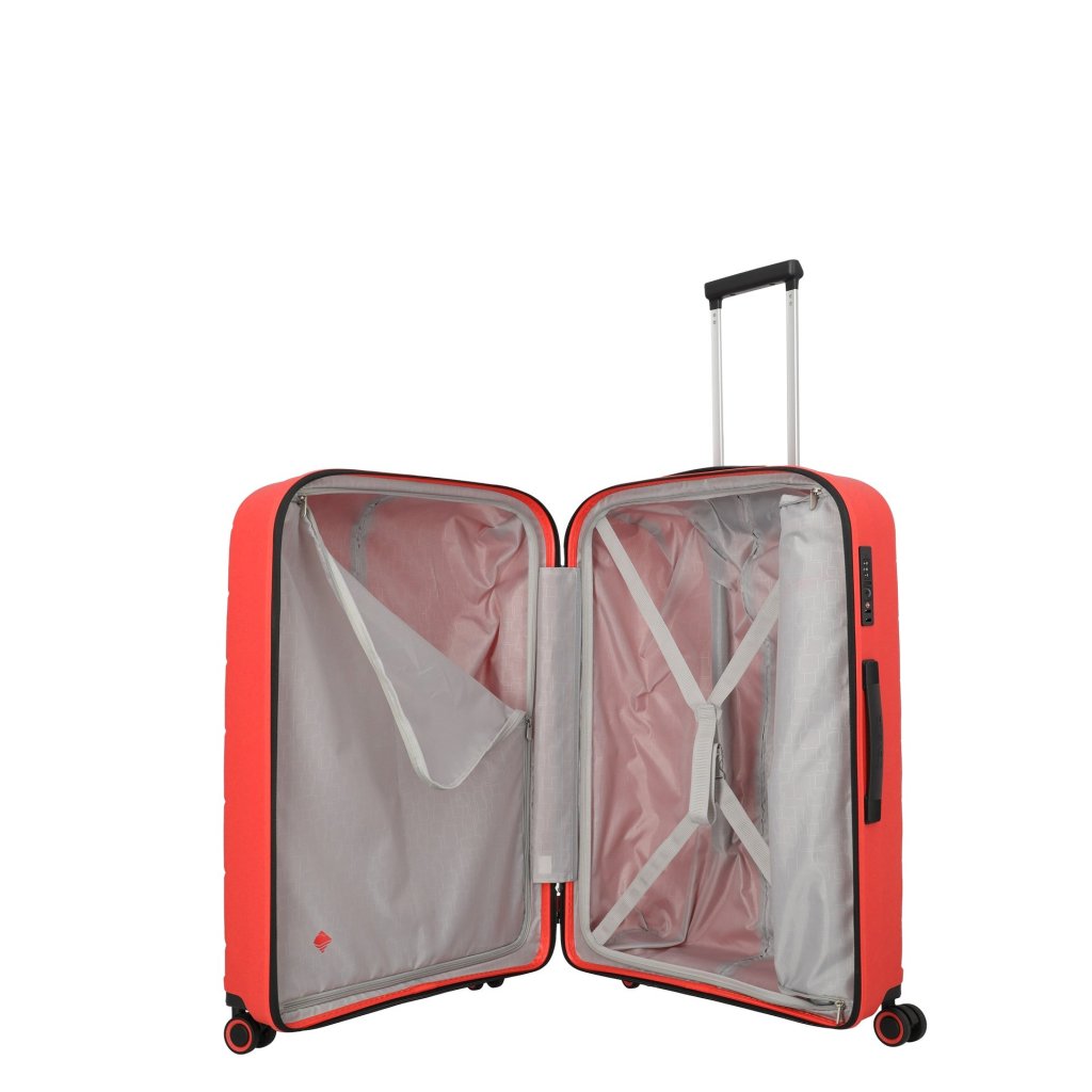 Interiér kufrů je prakticky rozdělen na dvě části uzavíratelné textilními příčkami na zip. Fixační popruhy udrží vaše věci stabilně na místě během přepravy.