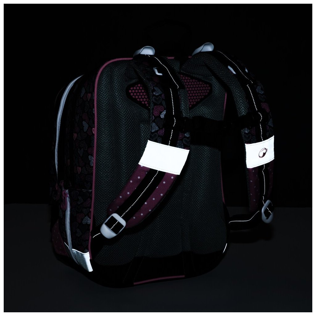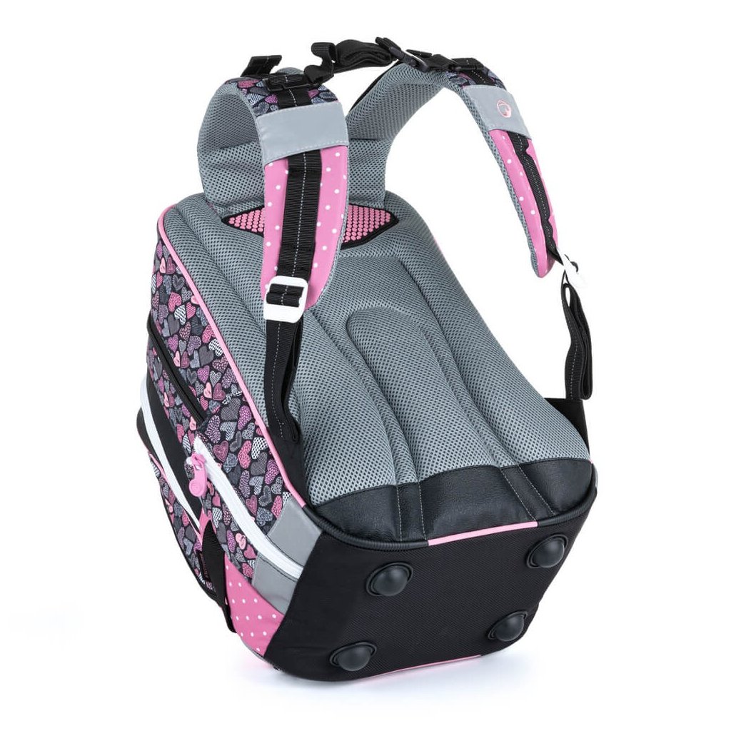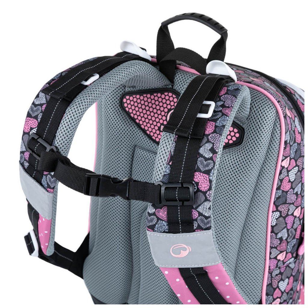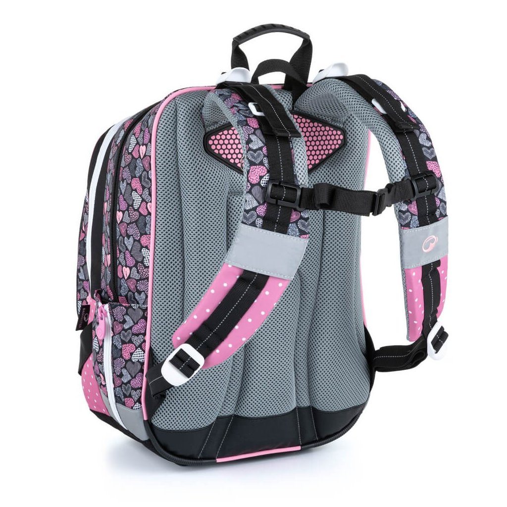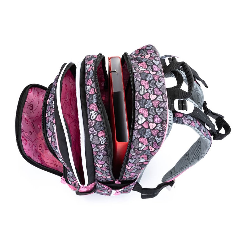 - Školní batoh: Prostorný tříkomorový batoh s anatomicky tvarovanými zády a lehkým hliníkovým rámem zajišťuje komfort při nošení. Nastavitelné ramenní popruhy s hrudní páskou a reflexními prvky zvyšují bezpečnost dítěte.