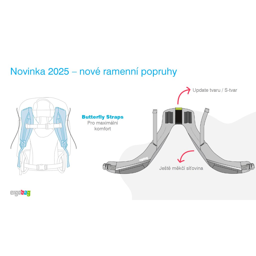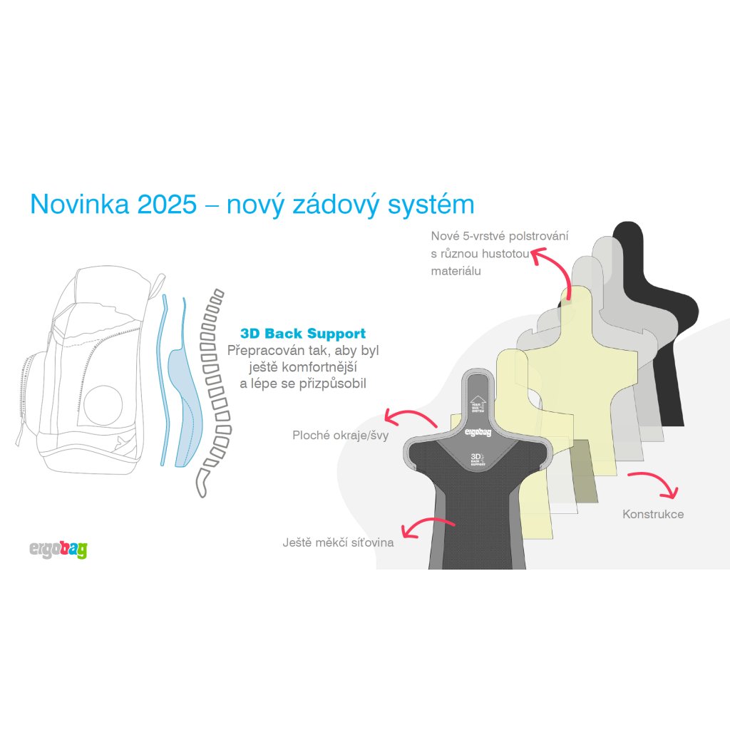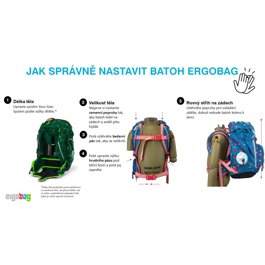 - Ergonomický design: Batoh Ergobag Prime je vybaven stabilizačním hliníkovým rámem a výškově nastavitelným nosným systémem "Your Size System", který se přizpůsobí výšce dítěte od 100 do 150 cm.