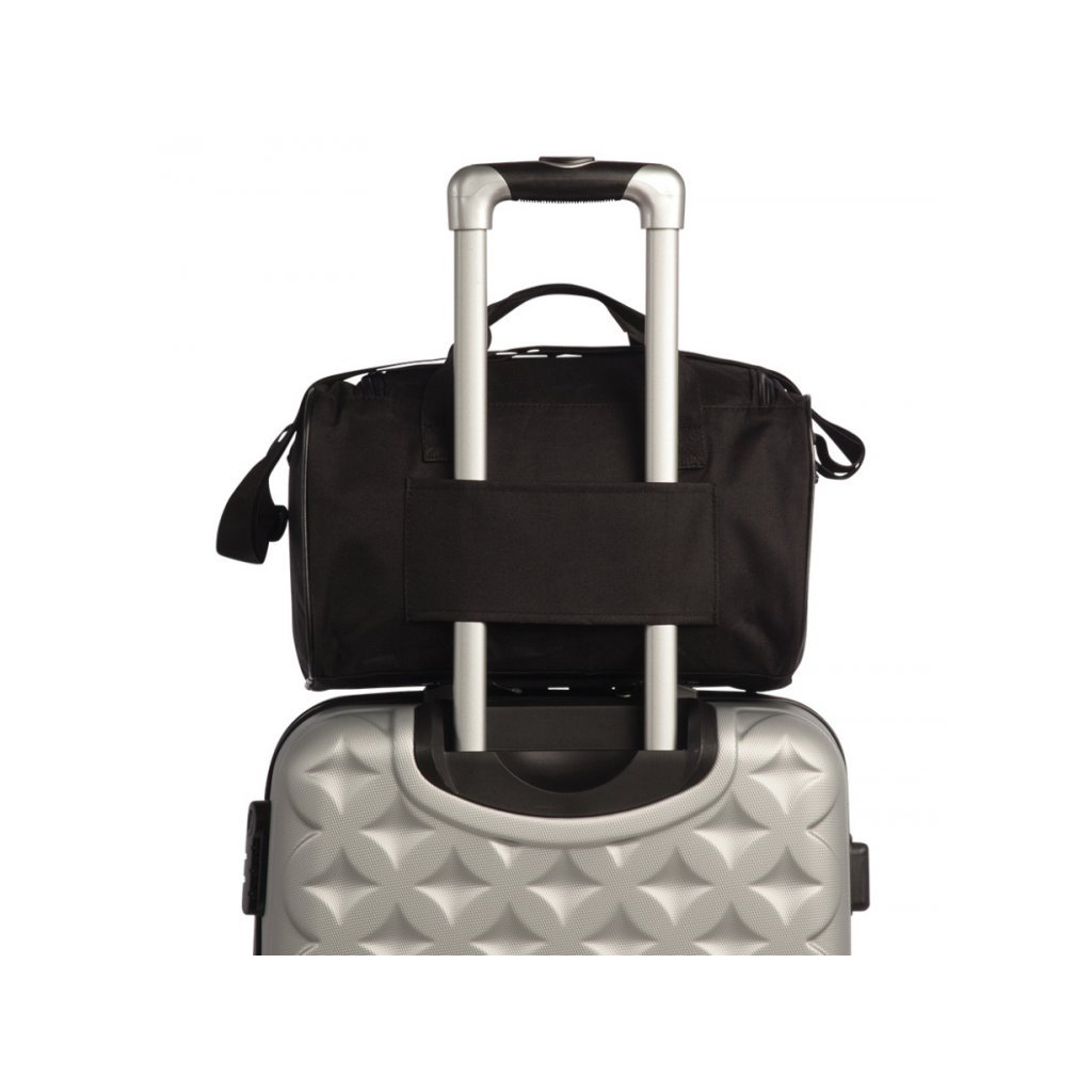 Nastavitelný ramenní popruh poskytuje flexibilitu při nošení, zatímco praktická ucha umožňují pohodlné držení v ruce. Navíc lze tašku snadno připevnit na výsuvné madlo cestovního kufru, což zjednodušťuje přepravu na letišti.