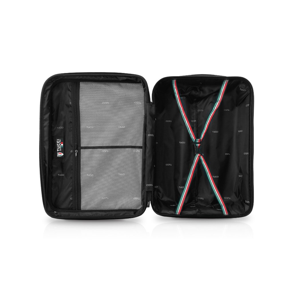 Středně velký skořepinový cestovní kufr z kolekce TUCCI Tesoro s expandérem. Celý pojízdný systém je umístěn uvnitř kufru pod textilní podšívkou, aby nedošlo k poškození systému při přepravě a je opatřen čtyřmi dvojitými kolečky otočnými o 360°.