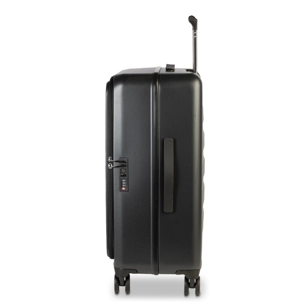 Kufr kombinuje praktické funkce, odolný ekologický materiál a snadnou manipulaci. Díky čtyřem otočným kolečkům a teleskopickému madlu se s ním pohodlně pohybujete i v rušném prostředí letišť či měst.