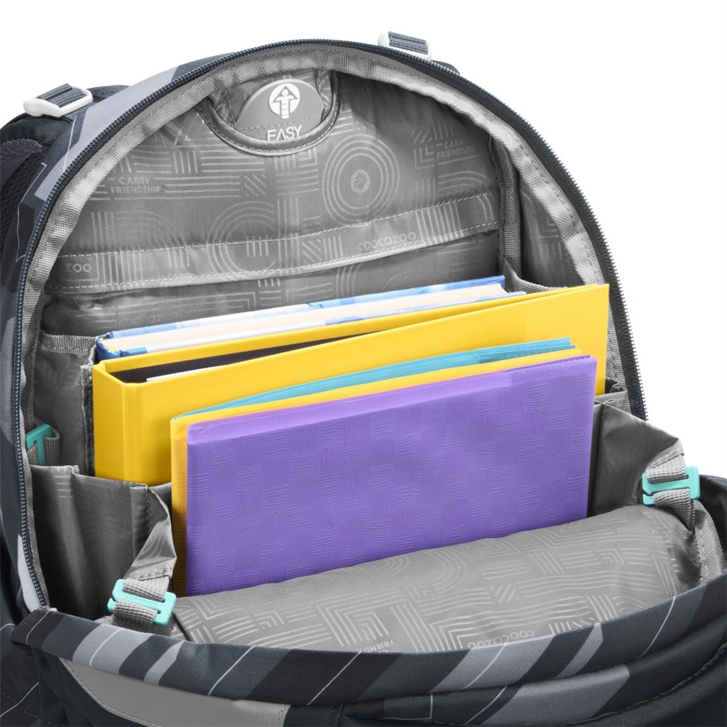 Vnitřní uspořádání batohu nabízí dostatek místa pro učebnice, sešity i každodenní výbavu. Hlavní přihrádka s integrovanou částí na knihy je umístěna blízko zad, což pomáhá s lepším rozložením hmotnosti.