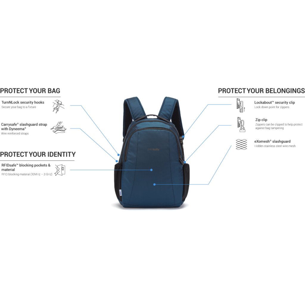 Batohem PACSAFE se nemusíte obávat krádeže. Je vybaven pokročilými bezpečnostními prvky, jako je TurnNLock bezpečnostní karabina, která umožňuje připoutání batohu ke stolu nebo jinému pevnému bodu. Systém Carrysafe® s dvěma zapletenými ocelovými lanky chrání popruhy před přeřezáním, zatímco přední kapsa je zabezpečena sítí ocelových lanek eXomesh®. Zamykatelné zipy a RFIDsafe® kapsa poskytují ochranu vašim čipovým kartám a dokladům.