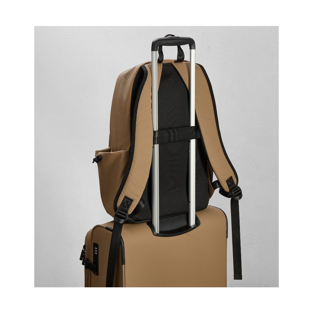 Odolný TPU polyester vyniká mechanickou pevností, odolností proti oděru i chemickému opotřebení a zároveň nabízí vyšší odolnost proti proříznutí a roztržení než běžný polyester. Pohodlí při nošení zajišťují nastavitelné polstrované ramenní popruhy a polstrovaná záda. Praktický popruh na zadní straně umožní batoh snadno připevnit na výsuvné madlo kufru, což oceníte na letišti i při přesunech po městě.