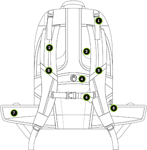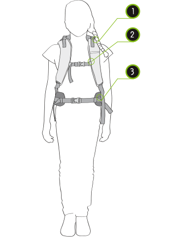 Polstrovaná bederní opěrka, hrudní popruh s nastavitelnou délkou a výškou, stejně jako popruhy pro nastavení polohy na ramenních popruzích pevně připevní batoh k zádům. Hmotnost se tak optimálně přesouvá z ramen do pánve. Díky tvaru S ramenních popruhů nesklouzávají z ramen. Hrudní popruh ho také fixuje.
