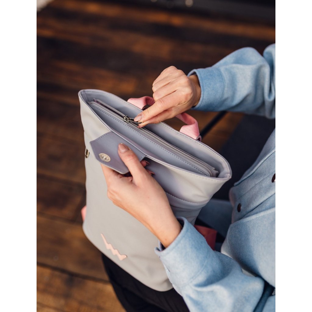 Bohatě vybavený vnitřek zahrnuje síťovanou přihrádku a menší kapsičku na zip, které pomáhají udržet pořádek. Hlavní prostor je chráněn zipem a magnetickou klopou pro maximální bezpečnost. Tři vnější kapsy na zip mají skrytá zapínání, což přispívá k minimalistickému designu.