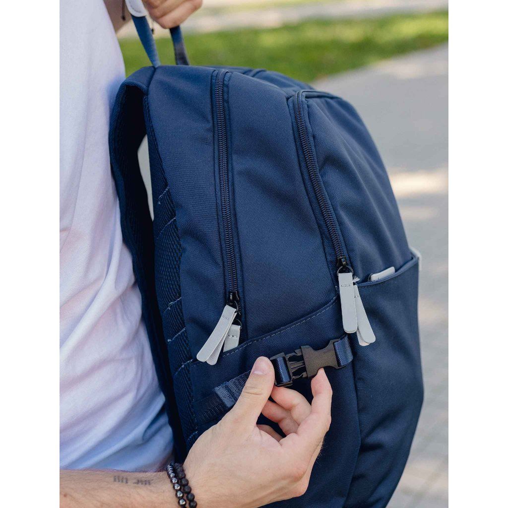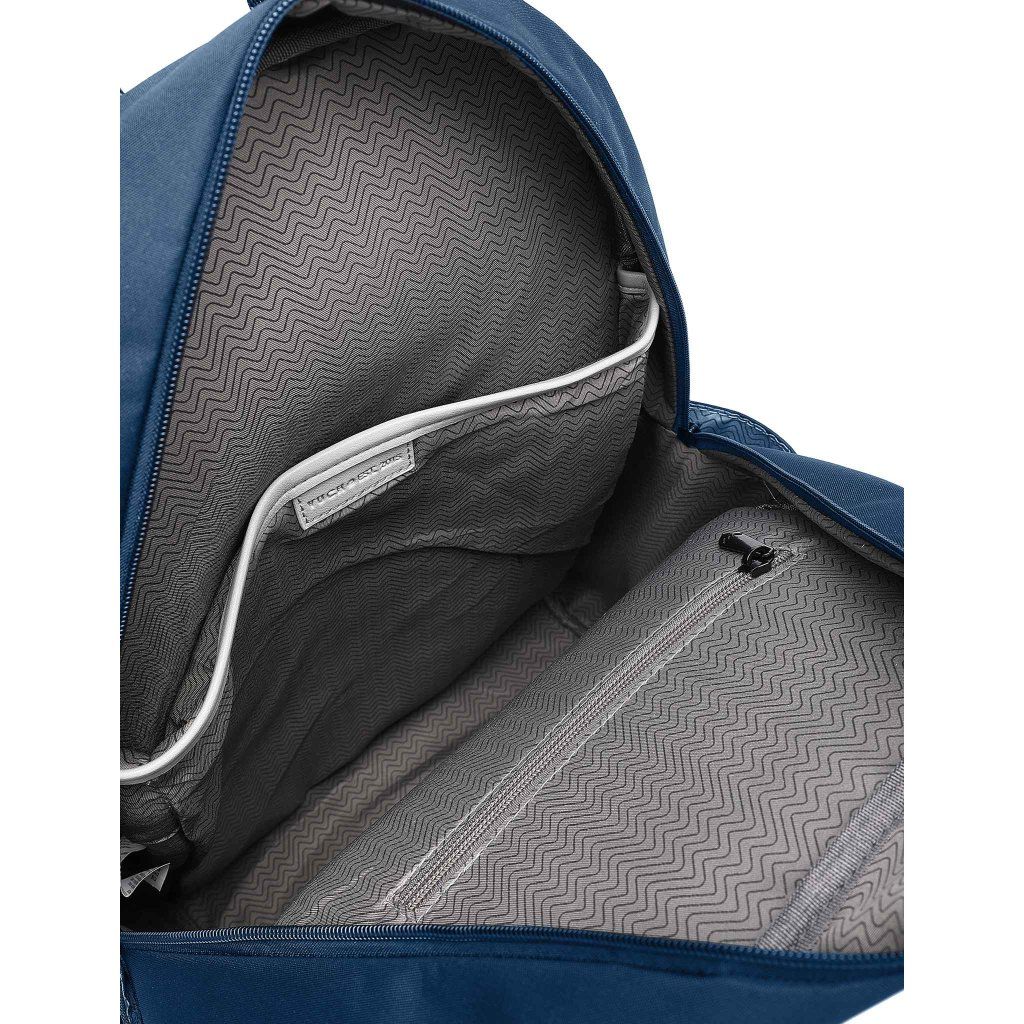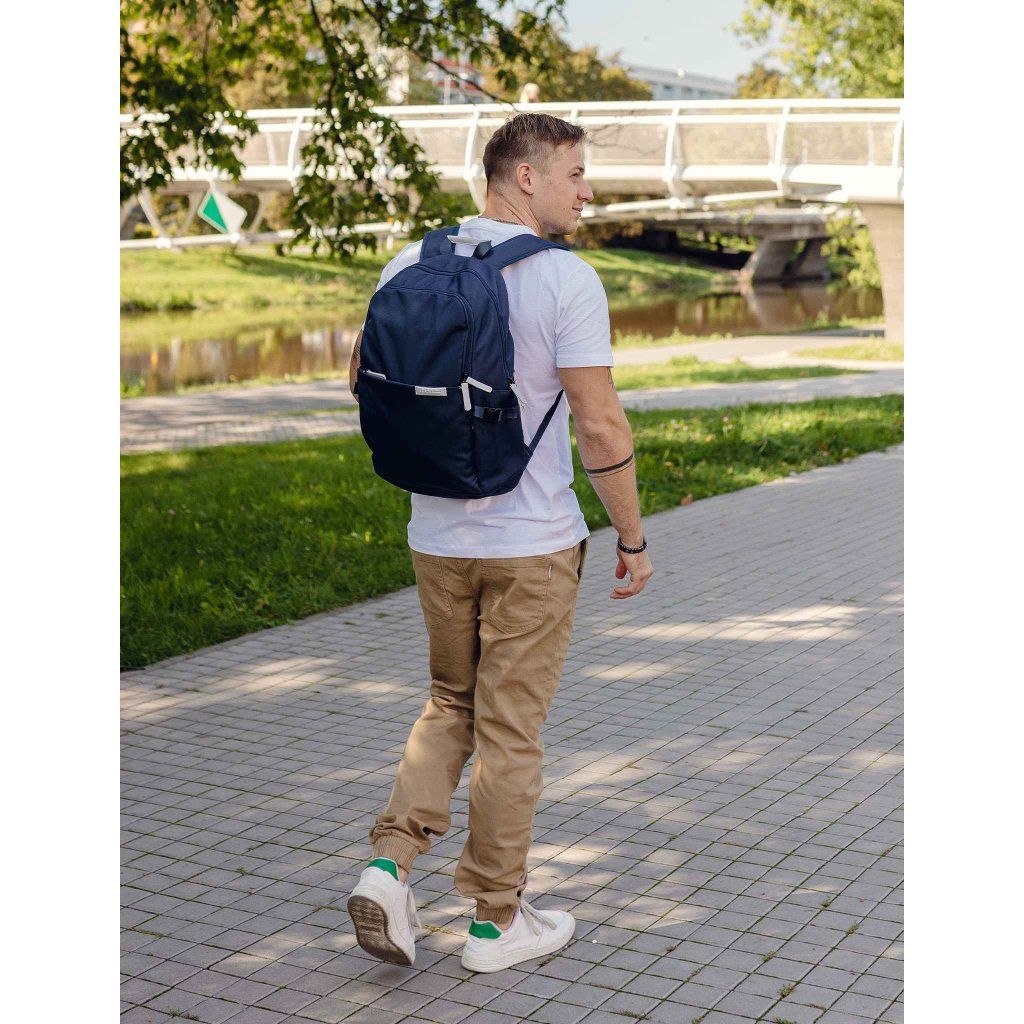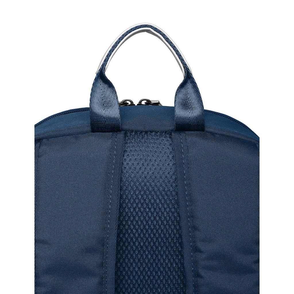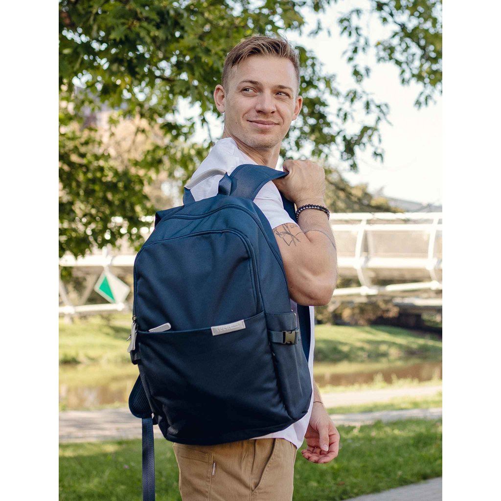 Modré provedení doplněné koženkovými detaily působí elegantně a zároveň sportovně. Polstrovaná záda a ramenní popruhy zajišťují pohodlné nošení i při delší zátěži. Materiál tvoří 90% polyester a 10% polyuretan, což mu dodává odolnost a dlouhou životnost.