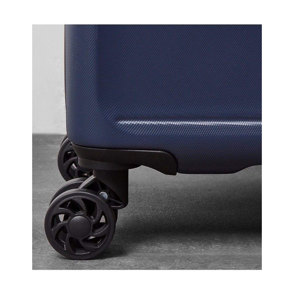 Kufr je vybaven čtyřmi dvojitými kolečky otočnými o 360°, což zajišťuje snadnou manipulaci i při plném zatížení. Teleskopické výsuvné madlo s aretací umožňuje pohodlné přenášení. Uvnitř najdete textilní přepážku ve víku, vnitřní kapsu na zip a fixační popruhy pro bezpečné uložení vašich věcí.