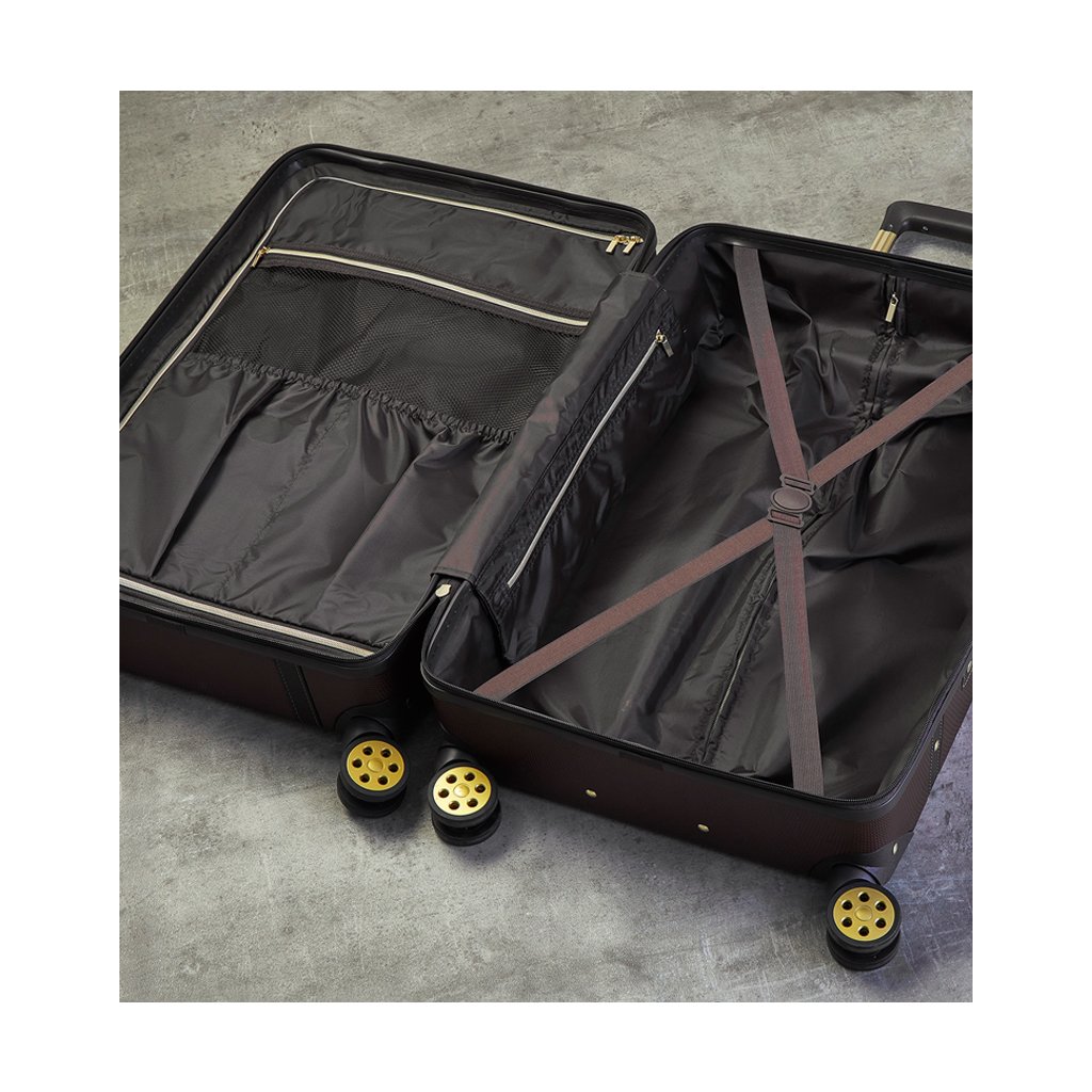 Kufr disponuje lehkým výsuvným systémem, který usnadňuje manipulaci. Vnitřní prostor je vybaven přepážkou s kapsou a jistícími popruhy pro bezpečné uložení vašich věcí. Horní i boční madlo ze syntetické kůže dodávají kufru elegantní vzhled.