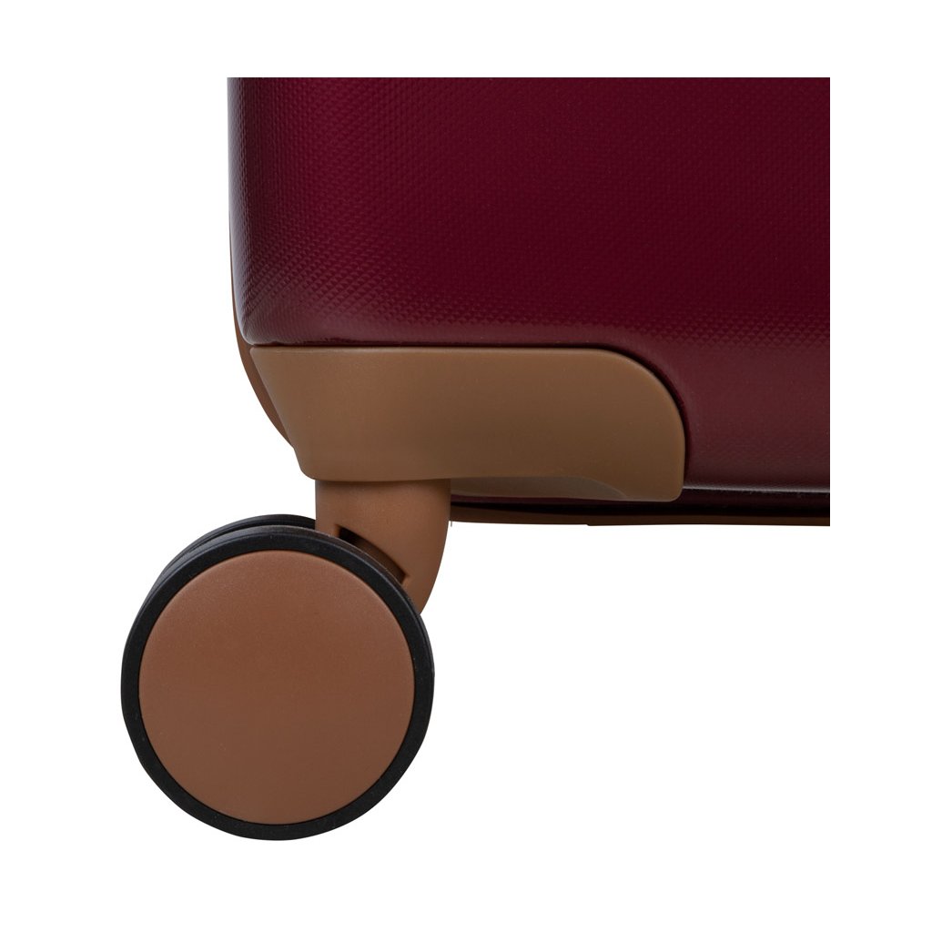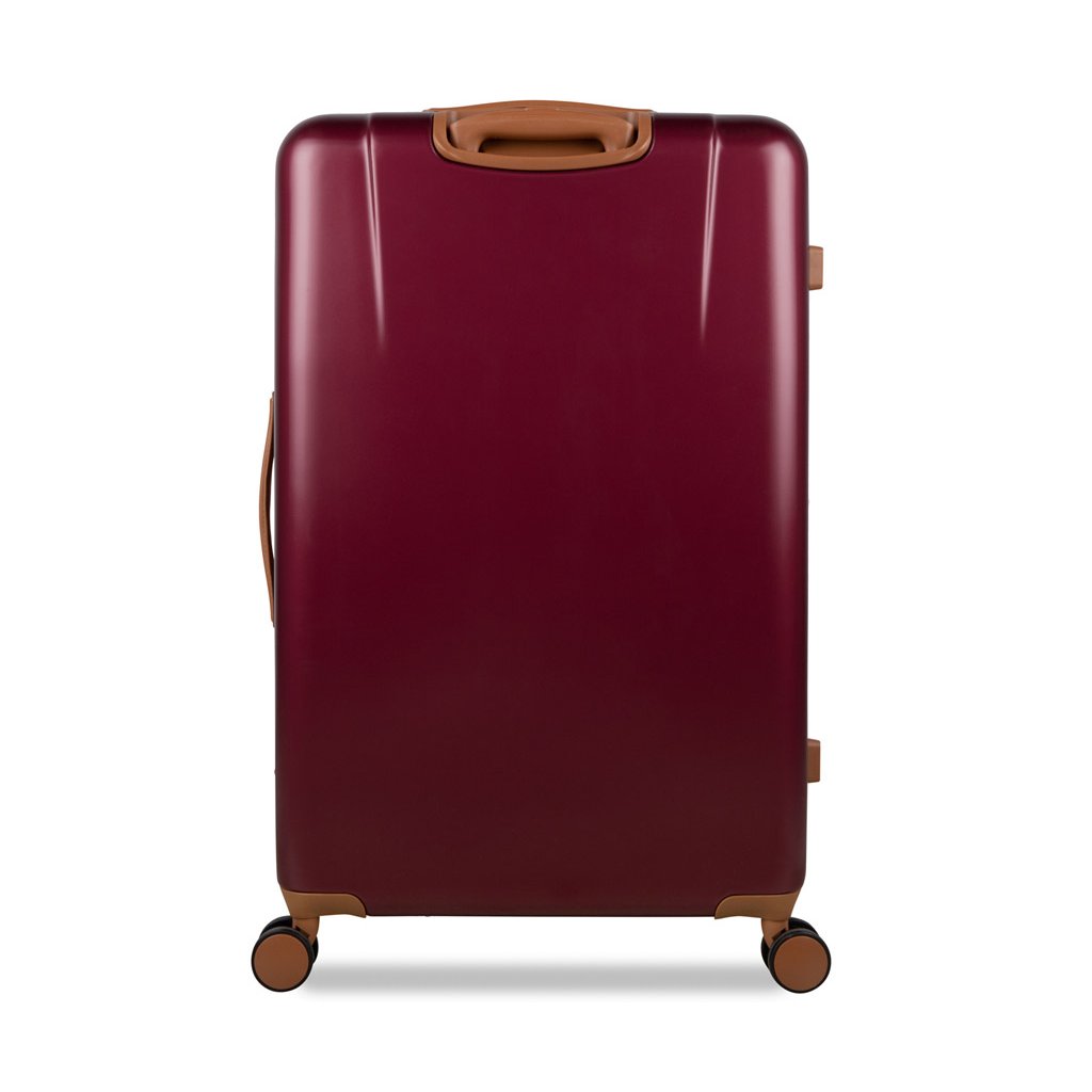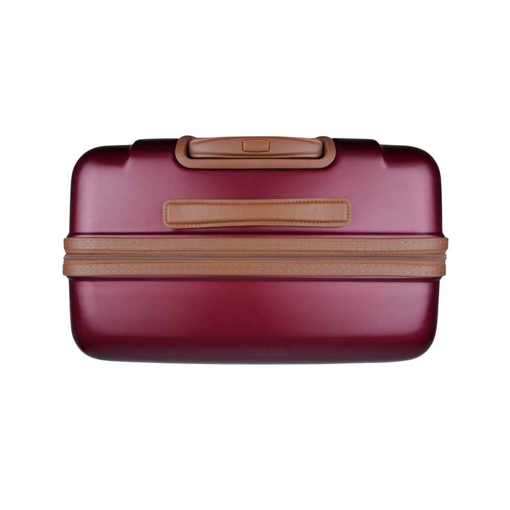 Kufr se pyšní minimalistickým designem s povrchovou úpravou v červené barvě, doplněnou o detaily z veganské kůže a růžového zlata. Vyroben je z odolného materiálu ABS a polykarbonátu, což zajišťuje jeho lehkost a odolnost proti nárazům.