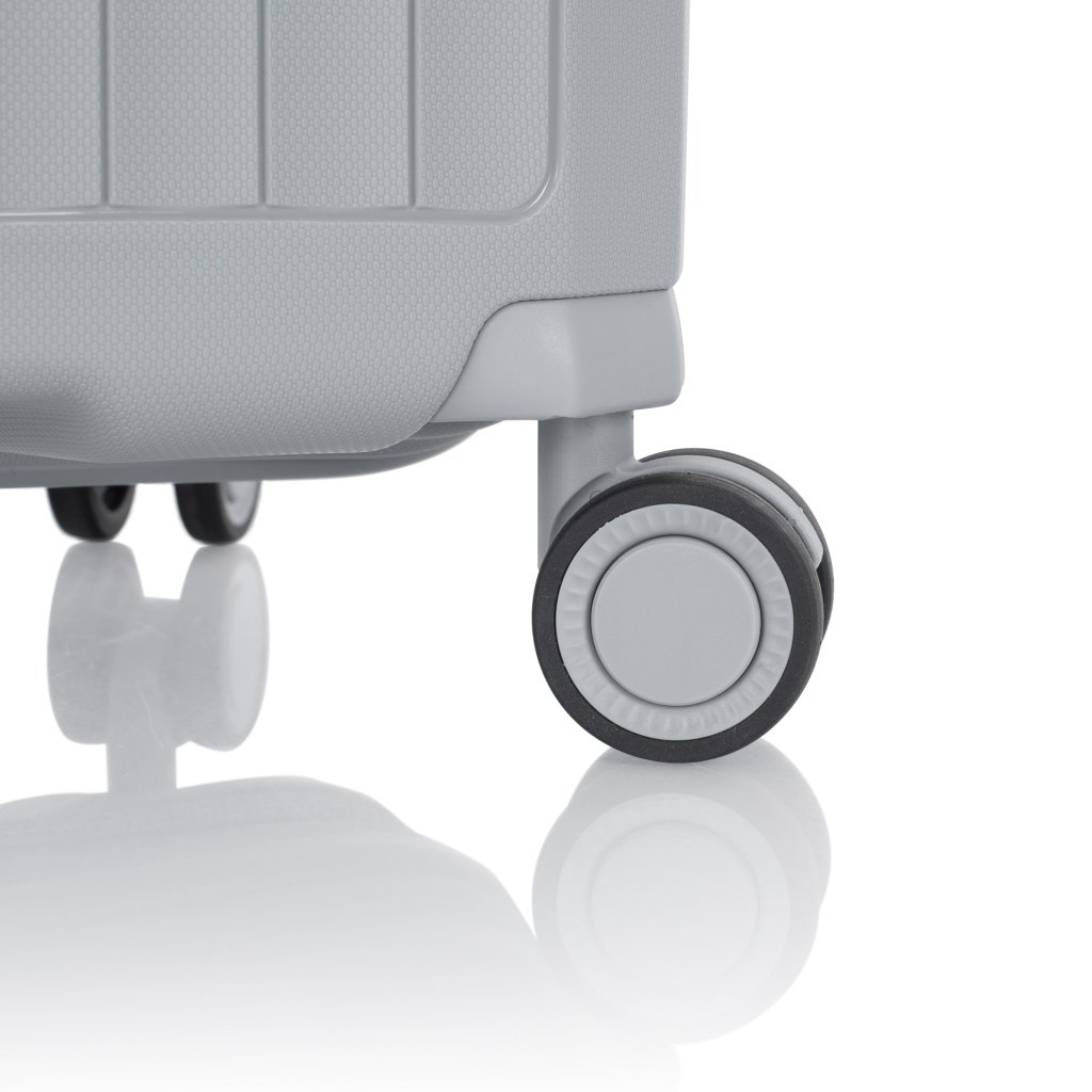 S Heys Airlite L se budete pohybovat snadno díky čtyřem otočným kolečkům a lehké výsuvné rukojeti z leteckého hliníku. Pevná horní a boční madla usnadňují manipulaci i v náročnějších podmínkách. Matný povrch dodává kufru elegantní vzhled, který podtrhne váš jedinečný styl.