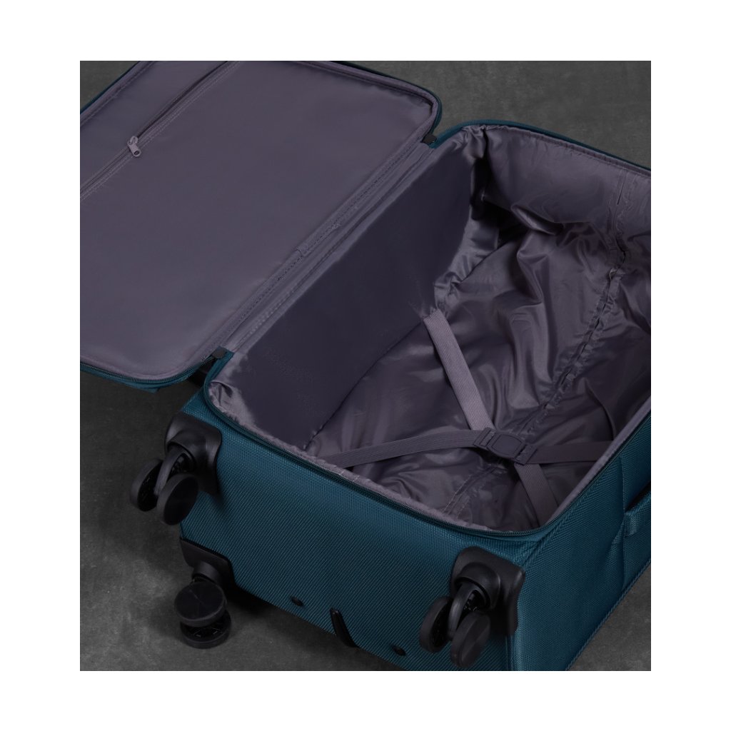 - Interiér: textilní přepážka, kapsy na zip, kompresní popruhy