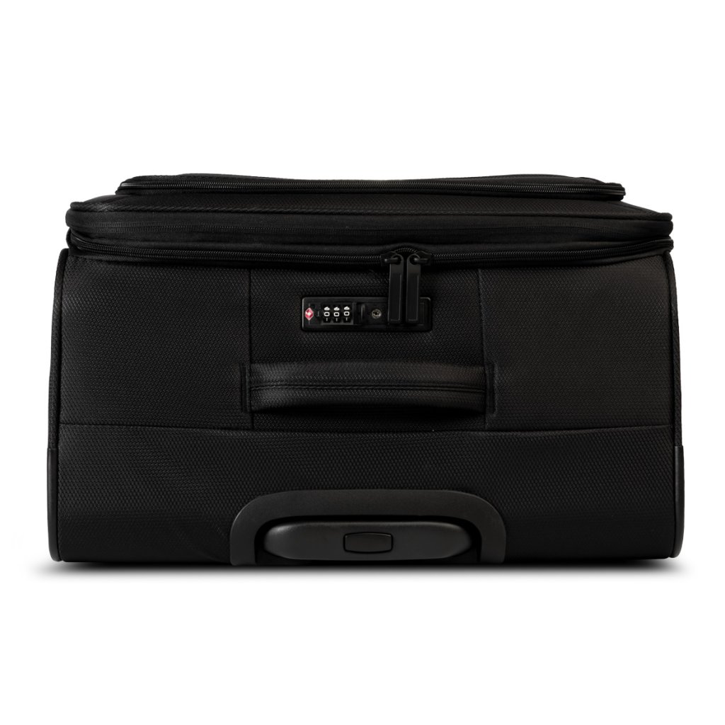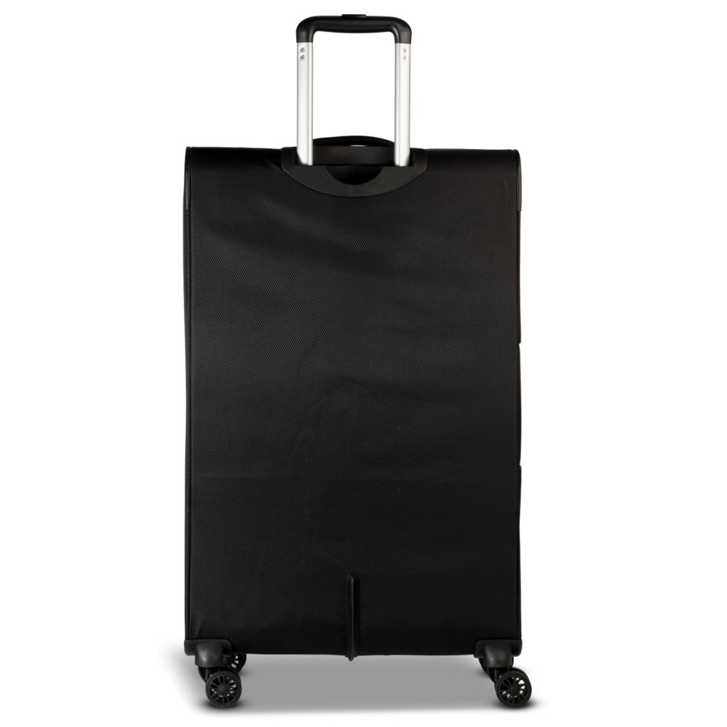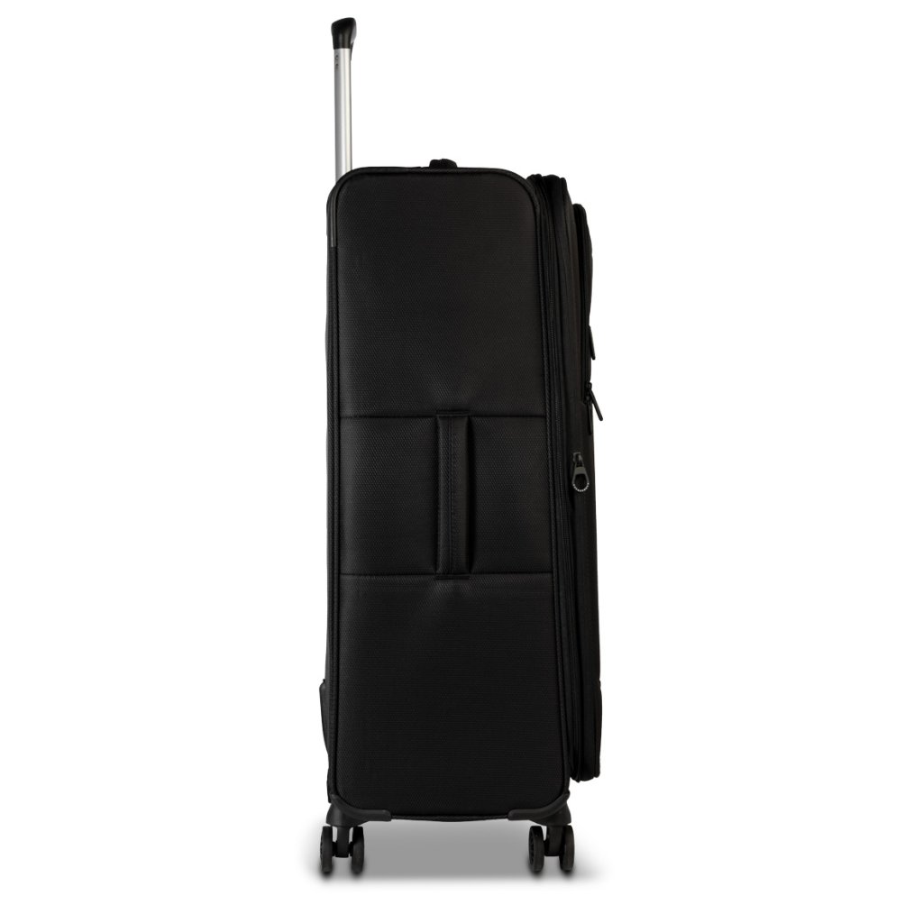 Kufr je vyroben z pevného 400D polyesteru, který je odolný proti mechanickému opotřebení a běžným nárazům při manipulaci. Konstrukci doplňuje stabilní spodní ochrana, hliníkové výsuvné madlo a praktická horní i boční madla pro snadné přenášení.